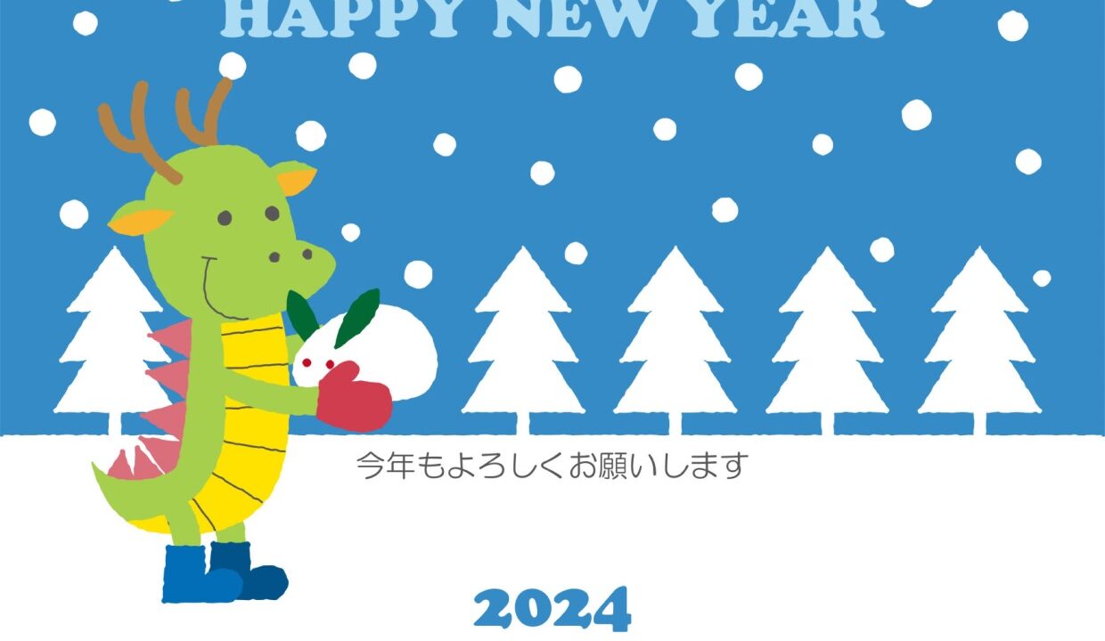 雪景色の白と青が際立つポップで冬を思わせるかわいい年賀状の無料でダウンロードが可能なテンプレートを2024年の辰年におすすめします。まんまるい雪が降る風景と、雪うさぎを持つ辰がほんわかした雰囲気を醸し出してくれる2024年の年賀状テンプレートです。
