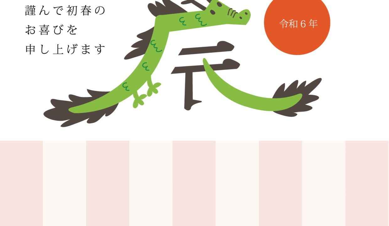 年賀状のパンフレットなどを見ていると、緑の龍は人気があるようです。朱色の円は日の出をイメージしています。下のストライプは画面に変化を付けるためであり、また紅白幕をイメージしています。シンプルな年賀状をお探しの方におすすめの2024年の無料イラストです。