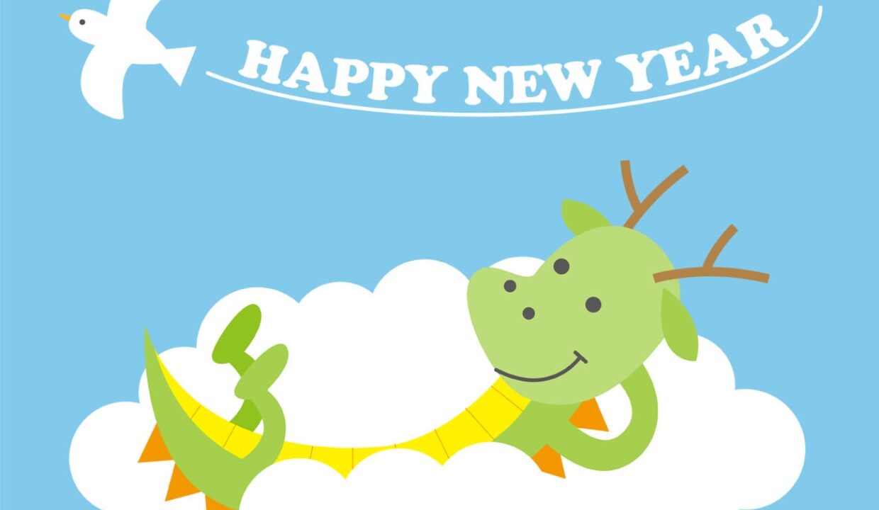 ポップでかわいいパステルカラーの年賀状をお探しの方におすすめです。2024年イラストテンプレート(辰年)は青い空にポッカリ浮かんだ雲の上で、気持ちよさそうに寝そべる辰がユーモラスな2024年年賀状です。
