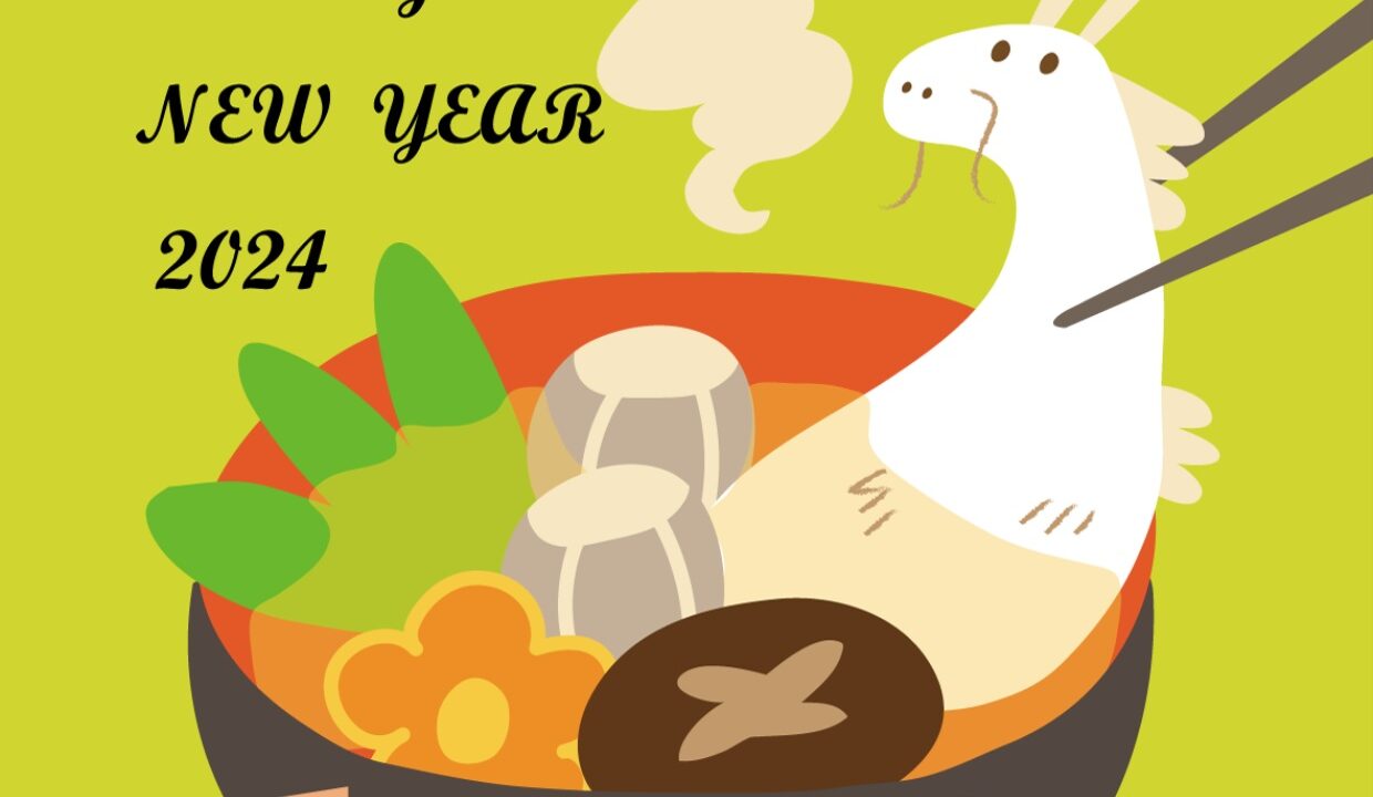 2024年のお正月な雰囲気が醸し出されているデザインのポップでかわいい年賀状です。辰年のおいしそうな食欲をそそるアツアツのお雑煮イラストが目を引く無料テンプレートです。お雑煮部分を干支で作る年賀状デザインはよくあります。